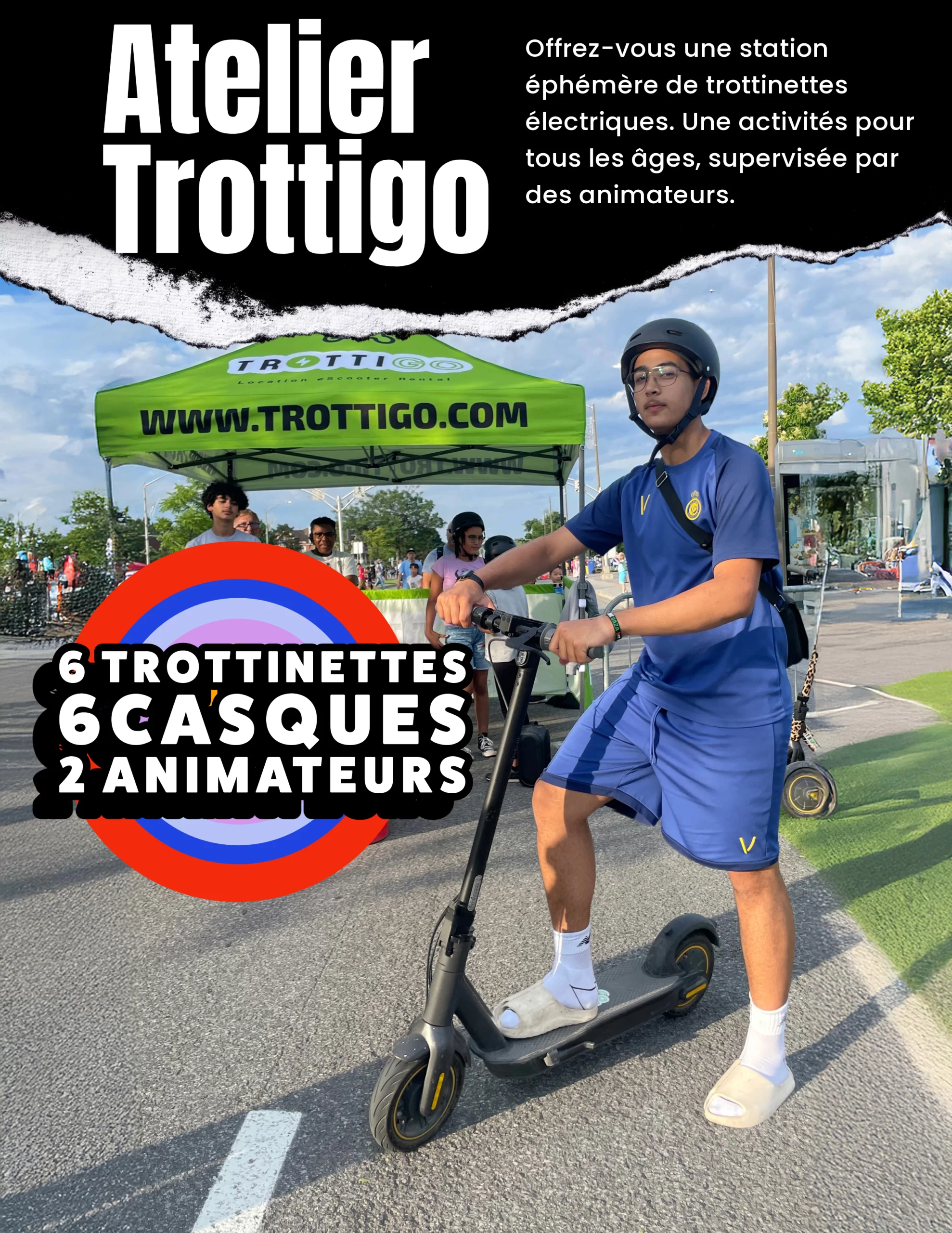 Enjoy a unique and fun experience with Atelier Trottigo! We offer a temporary electric scooter station, ideal for livening up your events and delighting young and old alike. Our qualified instructors ensure the safety and supervision of participants, manage crowds and ensure that the activity runs smoothly on a closed circuit. The activity is accessible to all, and requires a minimum space of 50 feet by 70 feet to set up the circuit. Delivery and installation are included in the price.